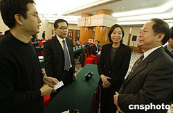 連續(xù)兩日舉辦的商務(wù)部首期服務(wù)外包培訓(xùn)班學(xué)術(shù)交流氣氛濃厚,許多成員借此機會向?qū)<覍W(xué)者請教咨詢。十二月十日,富士施樂(中國)有限公司副總裁李濟華(右)、北京博思商通資訊有限公司董事長曾松(左二)與商務(wù)部有關(guān)人員一起交流。中新社記者:任海霞