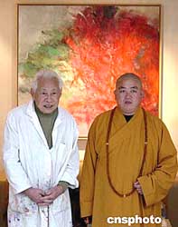 著名旅法華裔畫(huà)家趙無(wú)極近日在巴黎的畫(huà)室與少林寺釋永信方丈合影。作者:鐘誠(chéng)