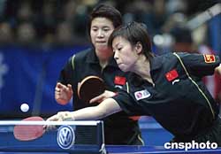 十二月十二日晚,王楠/張怡寧在北京舉行的大眾汽車2004年國際乒聯(lián)職業(yè)巡回賽總決賽女雙決賽中戰(zhàn)勝郭躍/牛劍鋒,奪得女雙冠軍。作者:武仲林