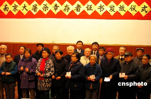 昨天,侵華日軍南京大屠殺幸存者援助協(xié)會向21位幸存者代表頒發(fā)了首批證書。首批獲得證書的共有179位幸存者。這本證書是對幸存者的身份和受害經(jīng)歷等自然狀況進行了完整核實后統(tǒng)一制作的。幸存者們憑借該證可以享受政府和社會各界給予的援助和優(yōu)惠政策,并且可以憑證免費參觀市內(nèi)七個文化場館、景點。