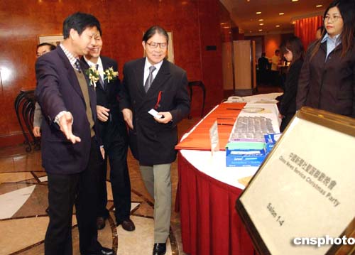 圖為中國(guó)新聞社總編輯郭招金[左]迎接中聯(lián)辦副主任王鳳超[中]蒞臨晚宴。作者:洪少葵