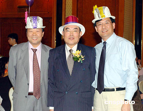 中聯(lián)辦副主任王鳳超[中]、中新社香港分社社長(zhǎng)章新新、香港文匯報(bào)社長(zhǎng)張國(guó)良[左]在晚宴上。作者:宋吉河