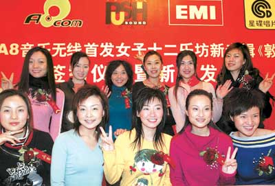 昨天,全部便裝的“女子十二樂坊”姑娘們出現(xiàn)在京廣中心的宴會廳,這身打扮跟她們平時出現(xiàn)在舞臺上的形象顯得自然樸實。由于其中一位成員因感冒在醫(yī)院打點滴來不了現(xiàn)場,于是“女子十二樂坊”成了“女子十一樂坊”了。這次新專輯的發(fā)布與以往任何的新專輯發(fā)布都不一樣,它是先將專輯中的音樂發(fā)布到電媒音樂(TeleMusic)平臺上,聽眾可以通過手機下載鈴聲或者彩鈴的形式先聽為快,而后才可以在全國音像店發(fā)行CD。這次發(fā)布創(chuàng)造了兩項國內第一:這是國內第一次通過電信媒體,發(fā)布電媒音樂形式的全新音樂專輯。同時,這是國內第一次將音樂通過電信媒體優(yōu)先發(fā)布,早于任何傳統(tǒng)渠道包括CD等。據(jù)介紹,為防止盜版,《敦煌》不會制成MP3的格式,只能通過手機下載。