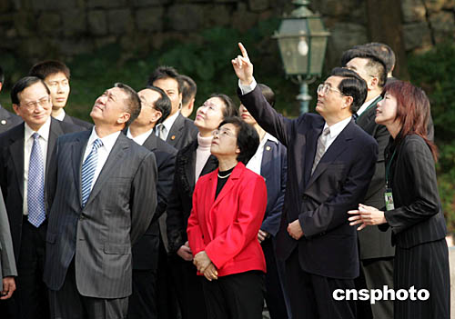 圖為行政長官何厚鏵陪同胡錦濤一行參觀。作者:董會峰