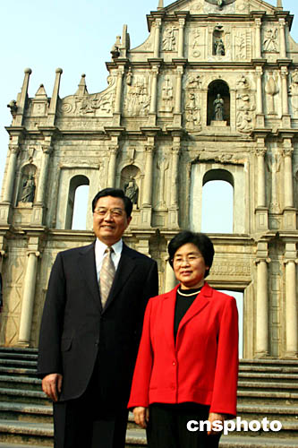 圖為胡錦濤和夫人劉永清在大三巴前合影。作者:董會峰