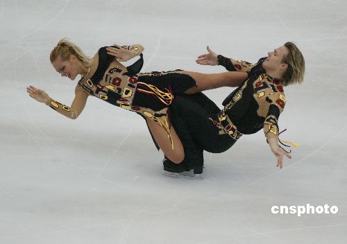 二零零四年十二月十八日晚在北京首都體育館舉行的世界花樣滑冰大獎賽總決賽冰舞比賽中,各國選手爭相斗艷,上演了一曲曲美侖美奐的冰上盛宴。圖為加拿大選手杜布雷爾/倫佐在比賽中。中新社記者:武仲林