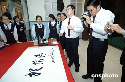 國家主席胡錦濤在參觀澳門勞工子弟學(xué)校時寫下了“胡錦濤”三字墨寶,引來學(xué)生爭相拍攝。