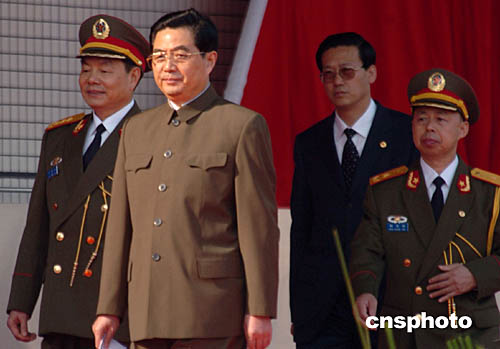 中新社澳門(mén)十二月二十日電(記者孫宇挺)今天下午十四點(diǎn)四十五分,中共中央總書(shū)記、國(guó)家主席、中央軍委主席胡錦濤來(lái)到(乙+水)仔軍營(yíng),視察中國(guó)人民解放軍駐澳門(mén)部隊(duì)營(yíng)區(qū)并閱兵。