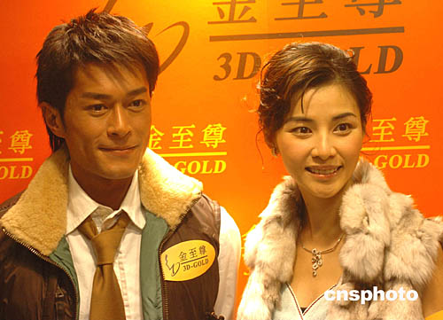 香港影視紅星古天樂﹑蒙嘉慧23日在香港出席金至尊銅鑼灣又一新店的開業(yè)儀式