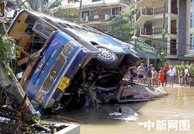 圖為海嘯席卷泰國(guó)普吉島后,被掀翻毀壞的大巴車。