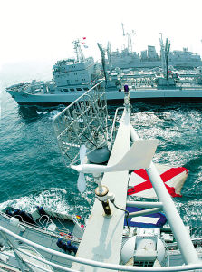 此次演練中,補給演練尤其引人注目。當中方指揮員張盤洪少將下達補給命令后,“哈爾濱”號、“拉圖什特威爾”號和“比羅司令”號3條戰(zhàn)艦呈倒品字形圍繞“洪澤湖”號航行,先后進行了3艦同時補給和單艦補給模擬演練。據(jù)了解,補給演練內(nèi)容是延長戰(zhàn)斗力的訓練課目,是檢驗海軍遠海聯(lián)合作戰(zhàn)能力的訓練。