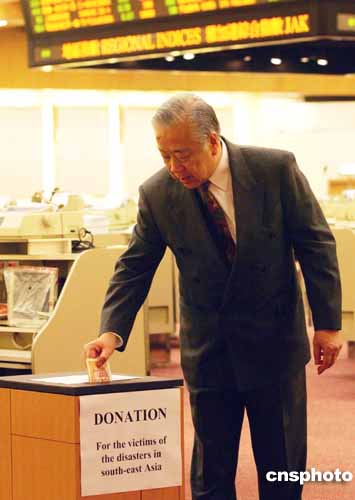 香港聯(lián)合交易所在早上開(kāi)市前為南亞大地震和海嘯災(zāi)難中的死者默哀1分鐘,并在大堂內(nèi)設(shè)置捐款箱,籌款賑災(zāi)。作者:洪少葵