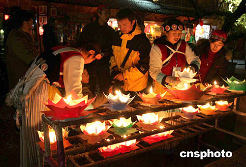 年終歲末,世界文化遺產(chǎn)--云南省麗江古城夜幕降臨后,盛裝的納西族姑娘在穿行古城的清清山泉溪水畔出售色彩各異的河燈,供同胞和游客在清冽的水中放河燈以許下來年美好的心愿。中新社記者:任晨鳴