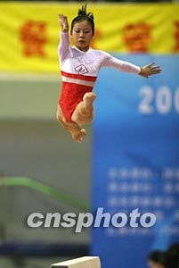 5月15日,在蘇州進(jìn)行的全國體操錦標(biāo)賽暨雅典奧運(yùn)會資格選拔賽中,中國國家女隊隊員張楠、康欣以37分并列個人全能第三。參加比賽的全部15名國家女隊隊員,總體表現(xiàn)尚可。圖為張楠在自由體操比賽中。中新社記者:盛佳鵬