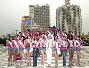 參加由澳門博彩股份有限公司承辦的“世界名模在澳門”活動的第十六屆世界模特小姐大賽三十國冠軍佳麗十七日首次匯聚濠江,在澳門著名的葡京酒店前廣場合影,展示風(fēng)采。中新社記者:李剛