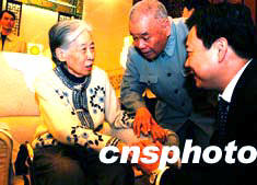五月十九日,山東省臨沂市在北京人民大會堂舉行《沂蒙頌歌》大型叢書贈書座談會,劉少奇夫人王光美等多位老將軍及夫人到會祝賀。圖為中共臨沂市委書記李群向王光美表示問候。作者:王麗南