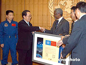 去年今年九月“神五”升空前四十天時,聯(lián)合國維也納辦事處代表安南秘書長,把一面聯(lián)合國旗幟移交給中國常駐維也納代表團,并現(xiàn)場轉交給中國載人航天工程辦公室。后來,這面聯(lián)合國旗和中國國旗伴隨楊利偉,在太空繞地球運行十四圈,行程約六十萬公里。今天,中國載人航天工程代表團訪問紐約聯(lián)合國總部。代表團成員楊利偉把這面旗幟正式移交回聯(lián)合國。