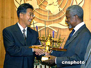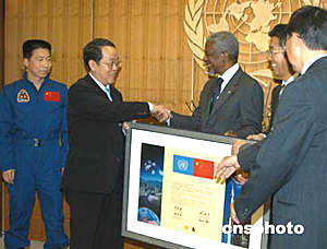 圖為中國(guó)常駐聯(lián)合國(guó)代表王光亞(左二)向聯(lián)合國(guó)秘書長(zhǎng)安南(右三)贈(zèng)送交旗證書,表達(dá)中國(guó)和平利用太空、造福全人類的美好愿望,以及對(duì)聯(lián)合國(guó)宗旨和原則的支持。