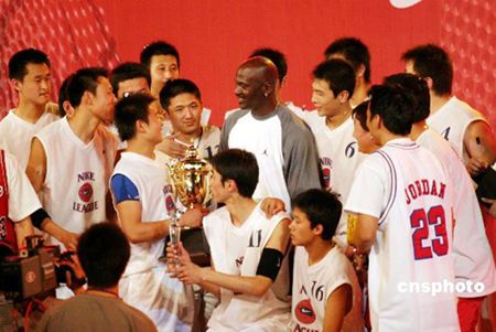 終于,當(dāng)主持人宣布喬丹即將入場之后,在尖叫、高呼、跺腳、鼓掌聲中,邁克爾·喬丹一襲運動裝步入賽場主席臺,并頻頻向觀眾點頭致謝。好不容易穩(wěn)定了大家的情緒,比賽繼續(xù)進行,盡管雙方隊員都非常投入地爭奪冠軍,但似乎已經(jīng)沒有觀眾關(guān)心比賽了。最后,沈陽三十一中以六十二比五十四戰(zhàn)勝對手。
