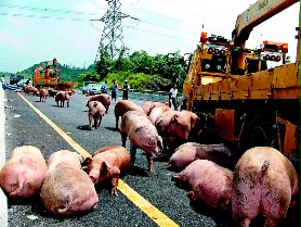 據(jù)臺灣媒體報(bào)道,一大清早一輛載豬的貨車在南二高嘉義路段突然爆胎翻覆,5、60只豬全被摔出來,有些豬受傷流血,有些嚇得直撒尿,不過大部份的豬生龍活虎跑到馬路上透氣,搗亂了高速公路上的交通。附近民眾看不下去,自動上來幫忙趕豬。