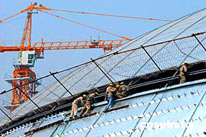 五月二十四日,建筑安裝工人正在國家大劇院殼體穹頂施工。國家大劇院橢圓形殼體穹頂自四月一日開始安裝鈦金屬板以來,工程進(jìn)展順利,預(yù)計(jì)六月底完成。中國國家大劇院由法國設(shè)計(jì)師保羅·安德魯設(shè)計(jì)。中新社記者:張煒