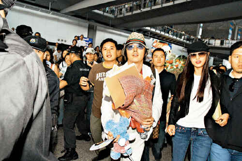 張赫戴上帽,身穿白衫白褲;全智賢則穿黑褸和牛仔褲,在昨午1時(shí)30分抵港,電影公司聘請(qǐng)了廿多位保安在機(jī)場護(hù)送兩人,但當(dāng)他們出閘時(shí),熱情Fans一擁而上,更突破了防線,令場面變得混亂;靵y中,張赫的Fans欲送鮮花給偶像,但卻錯(cuò)手擊中全智賢的頭部,“中頭獎(jiǎng)”的全智賢用手摸頭頂呼痛,之后一度黑口黑臉。