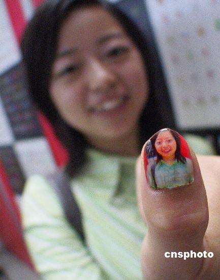 5月26日,一名年輕女性在江蘇展覽館向人們展示以自己形象為圖案的指甲。正在這里舉辦的第七屆美容美發(fā)博覽會上展示的最新技術(shù)數(shù)碼美甲機(jī)可以將各種圖案畫在你的指甲上,甚至是你自己或家人的照片。秦淮 攝