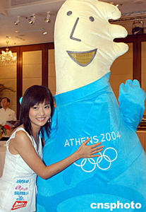 歌星董敏莉5月28日在香港出席無(wú)線(xiàn)電視《雅典奧運(yùn)·上下一心共創(chuàng)新里程》誓師大會(huì),董敏莉被可愛(ài)的奧運(yùn)吉祥公仔吸引。作者:鄧慶樂(lè)