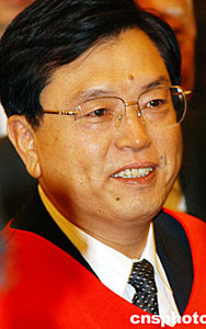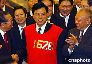 中共中央政治局委員、廣東省委書記張德江,五月三十一日來(lái)到香港聯(lián)合交易所進(jìn)行訪問(wèn),圖為出市代表贈(zèng)送張德江紅馬甲。中新社記者:錢興強(qiáng)