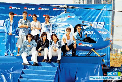 在直升機(jī)場(chǎng)上,先安排九位巨星為“百事”小型直升機(jī)進(jìn)行揭幕儀式,又與直升機(jī)合照。“城城”識(shí)搶位,第一時(shí)間沖入直升機(jī)坐上機(jī)師位,其它巨星就只是在飛機(jī)旁合照。