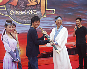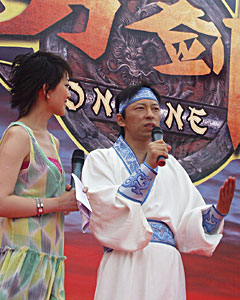 在象征著中國龍的居庸關長城腳下,上千位手持搜狐“群英帖”的嘉賓匯集一堂,儼然一場名副其實的江湖群英會!兜秳nline》發(fā)布會以氣勢恢弘的舞龍開場,代表著《刀劍Online》將在群雄逐鹿的網游市場,以原汁原味的中國功夫開篇中國人自己的網游傳奇!八押崎T人”張朝陽一身古代俠士裝扮出場,一番刀劍揮舞,顯示了不凡的武功造詣。而作為此款網游主題音樂代言人的內地著名歌手孫楠則以一曲曲風高揚,極具武俠風格的《刀劍》將發(fā)布會氣氛推向高潮。