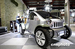 六月七日,一名工作人員在北京國際展覽中心展臺上布置一款新型的JEEP概念車。二零零四年北京國際汽車展覽會將于二零零四年六月十日至十六日在中國國際展覽中心和全國農(nóng)業(yè)展覽館舉行。中新社記者:盛佳鵬