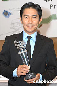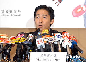 影帝梁朝偉6月8日在香港出席《第八屆香港國際影視展》新聞發(fā)布會,并獲委任為「2004年度香港影視娛樂大使」,香港貿(mào)發(fā)局影視娛樂業(yè)咨詢委員會主席鄒文懷(右),及貿(mào)發(fā)局服務(wù)業(yè)拓展總監(jiān)陳嘉怡(左)攜手將紀(jì)念品贈予梁朝偉。作者:鄧慶樂