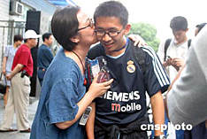 六月八日,全國(guó)高考結(jié)束,北京第四中學(xué)考點(diǎn)外的一位母親對(duì)剛剛步出考場(chǎng)的孩子送上深情地一吻,祝賀孩子順利完成高考。中新社記者:張勤