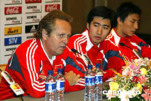 二零零六年世界杯足球賽亞洲區(qū)預賽中國隊對馬來西亞隊的比賽將于六月九日晚在天津舉行,中國足球隊主教練阿里漢六月八日在新聞發(fā)布會上表示,中國與馬來西亞隊的比賽將是一場艱苦的比賽,隊員們已經(jīng)做好了準備。中新社記者:毛建軍