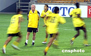 六月八日,馬來西亞足球隊在天津泰達足球場進行適應場地訓練。二零零六年世界杯足球賽亞洲區(qū)預賽中國隊對馬來西亞隊的比賽將于六月九日晚在這里舉行。圖為馬來西亞主教練哈里斯正對隊員進行現(xiàn)場指導。中新社記者:毛建軍
