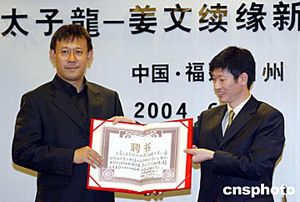 影帝姜文六月十三日在福州出席“太子龍-姜文續(xù)緣新聞發(fā)布會(huì)”時(shí),接受浙江太子龍服飾有限公司董事長(zhǎng)王培火頒發(fā)的聘書(shū),繼續(xù)擔(dān)任太子龍形象代言人。這種延續(xù)合作在中國(guó)文藝界名人中為數(shù)不多。由姜文監(jiān)制并主演的太子龍新廣告片十三日在福州與媒體和觀眾見(jiàn)面,其精湛的演繹再次獲得眾口一詞的贊嘆。中新社記者:毛建軍