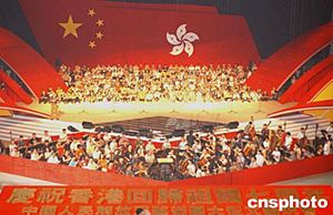 為慶祝香港回歸祖國(guó)七周年,中國(guó)人民解放軍400人的藝術(shù)團(tuán)將與23日、24日在香港紅(石+勘)體育館舉行兩場(chǎng)盛大演出。22日下午全體演職人員在現(xiàn)場(chǎng)進(jìn)行第一次走臺(tái)排練。作者:趙振清
