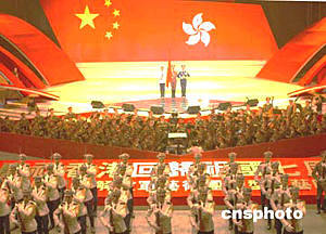 中新社香港六月二十三日電(記者 曉萍)“早聽(tīng)說(shuō)你的霓虹燈很亮很亮,早知道你的紫荊花金秋開(kāi)放……你好啊香港,你的明天更加美好!,帶著祖國(guó)的深情厚意,解放軍藝術(shù)團(tuán)今晚在紅磡體育館舉行“慶祝香港回歸七周年大型文藝晚會(huì)”首場(chǎng)演出,諾大的紅館座無(wú)虛席,掌聲不斷。