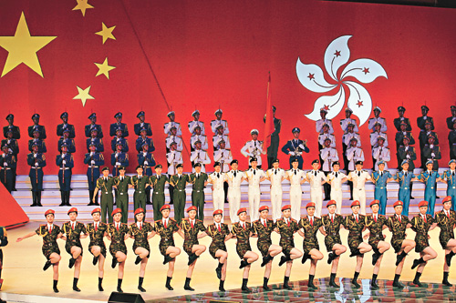 在“香港你好”一章中,藝術(shù)團(tuán)還特別演唱了“獅子山下”、“東方之珠”等反映香港市民生活和自強(qiáng)不息的歌曲!皵y手踏平崎嶇……用艱辛努力寫下那不朽香江名句”,市民熟悉的歌詞在場內(nèi)回旋,這是香港人的心聲,也是藝術(shù)團(tuán)對香港的美好祝愿,數(shù)千名觀眾以如潮的掌聲熱烈回應(yīng)藝術(shù)家們的深情祝福。