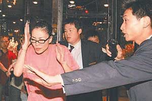 王菲和其助理、孫楠、李亞鵬乘林肯車回酒店,計(jì)劃由孫楠充當(dāng)攝影記者的擋箭牌,分散注意力,保護(hù)二位順利上樓?墒且饬现獾氖,在酒店門外,十多位王菲的歌迷,苦等了一夜,依舊站在那里不停地呼喊,氣勢(shì)不減;還有,記者的兩臺(tái)車始終分隔在林肯轎車的前后,原本要躲避影迷從酒店員工通道進(jìn)入的林肯轎車不得不兜了一大圈后,?吭诰频暾T。歌迷瘋狂到了極點(diǎn),孫楠根本無法引開火力,緊要關(guān)頭,一向低調(diào)的王菲親自掩護(hù)起李亞鵬來。