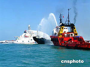 今天參加聯(lián)合搜救演習(xí)的船只共有二十九艘、另有香港飛行服務(wù)隊(duì)兩架飛機(jī)參加行動(dòng)。按照演習(xí)預(yù)定的項(xiàng)目,假設(shè)在南海某一海域發(fā)生船舶爆炸起火事故,十二名船員棄船逃生,船上有燃油溢出污染海面;另一艘船舶沉沒,十余名船員落水。海南省海上搜救中心接到報(bào)告后,立即啟動(dòng)應(yīng)急搜救程序,隨即展開了一場(chǎng)海陸空全方位的海上搜尋救助、海上消防滅火和海上溢油應(yīng)急行動(dòng)。結(jié)果成功營(yíng)救了所有落水船員,并對(duì)遇險(xiǎn)船只進(jìn)行了消防、對(duì)海面進(jìn)行了清理污染的行動(dòng)。