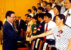 第八屆中國青年科技獎六月二十八日在北京揭曉并頒獎。圖為中共中央政治局委員、中央人才工作協(xié)調(diào)小組組長賀國強(qiáng)接見獲獎代表。作者:郭昊