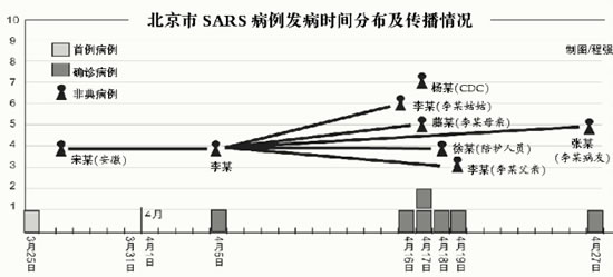 賀雄說,根據(jù)流行病學(xué)調(diào)查,可以判定,北京市發(fā)現(xiàn)的首例病例李某的傳染源為安徽非典患者宋某,隨后,李某又感染了自己的親屬和同病室病友,這個傳播鏈基本確定,即“首發(fā)病例宋某—李某—李某家庭及醫(yī)院傳播”。