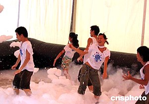 香港海洋公園在盛夏時(shí)節(jié)推出全新游戲節(jié)目“夏水禮”,吸引游客蒞臨。圖為7月7日充滿(mǎn)活力的年輕舞者在“泡泡舞池”聞歌起舞,帶動(dòng)熱鬧氣氛。作者:李炘