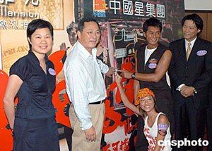 港產(chǎn)電影《柔道龍虎榜》兩位男女主角古天樂、應(yīng)釆兒及導(dǎo)演杜琪峰7月7日在香港出席樓盤長旺雅苑「電影預(yù)展中心」揭幕儀式,并主持亮燈儀式。作者:鄧慶樂