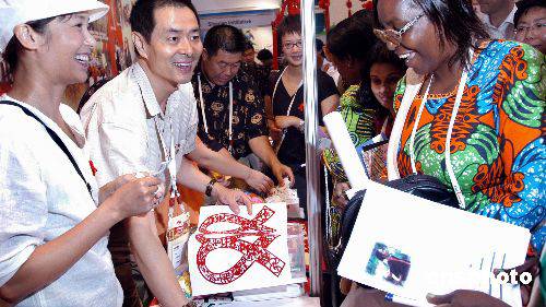 中國(guó)著名影星濮存昕(左二)、蔣雯麗七月十二日在第十五屆世界艾滋病大會(huì)中國(guó)展位上向觀眾推薦預(yù)防艾滋病中國(guó)剪紙——“紅絲帶”。中新社記者:曾利明