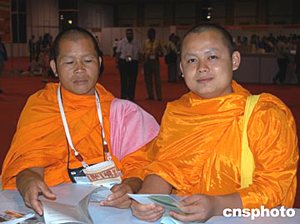 2004年7月初,兩位身著袈裟的泰國僧人,作為志愿者為第十五屆世界艾滋病大會(huì)會(huì)務(wù)服務(wù)。中新社記者:曾利明