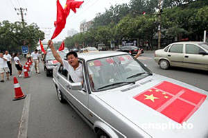 遼寧盤錦球迷驅(qū)車趕到北京,觀看七月十七日晚在北京工人體育場舉行的二零零四年亞洲杯足球賽揭幕戰(zhàn)。中新社記者:毛建軍