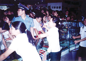 下午2時,當記者趕赴現(xiàn)場時,書城門口的廣場已經(jīng)被少男少女們“霸占”得幾無落腳之處。書城因此停止了營業(yè),禁止人員隨意出入;在近百名保安和工作人員的強力控制下,歌迷們被分批放進簽售內(nèi)場,每次只放進五六個人。大量無法入內(nèi)的歌迷因此不得不擁擠在書城門口內(nèi)外,無法前進,也無法抽身后退。書城幾乎把所有的保安和工作人員都調(diào)集到現(xiàn)場來維持秩序,在林俊杰和歌迷群之間形成了一道人墻。